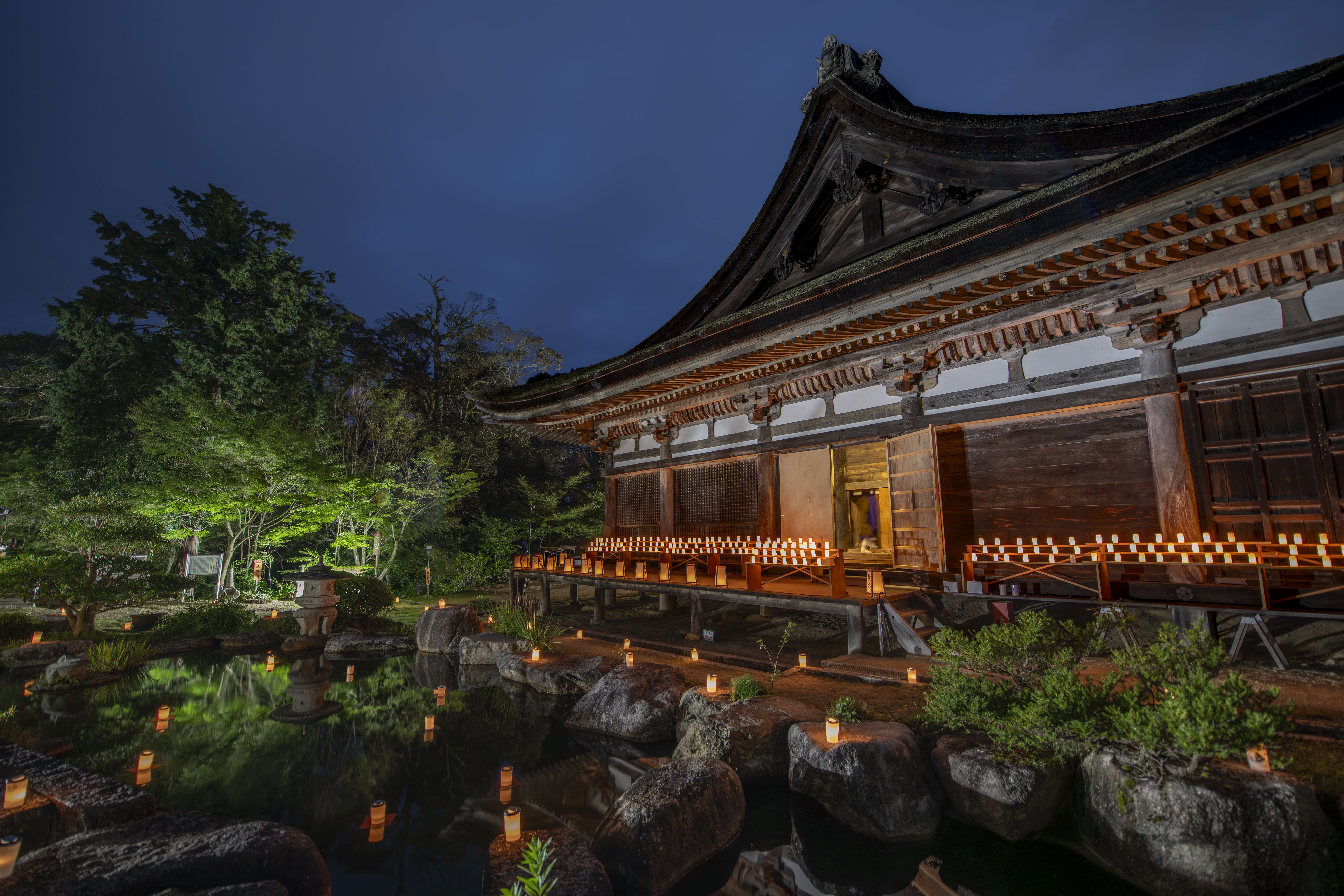 ゆらぐ光の帯に本堂が浮かび上がり、あたりは幻想的な雰囲気に包まれます。